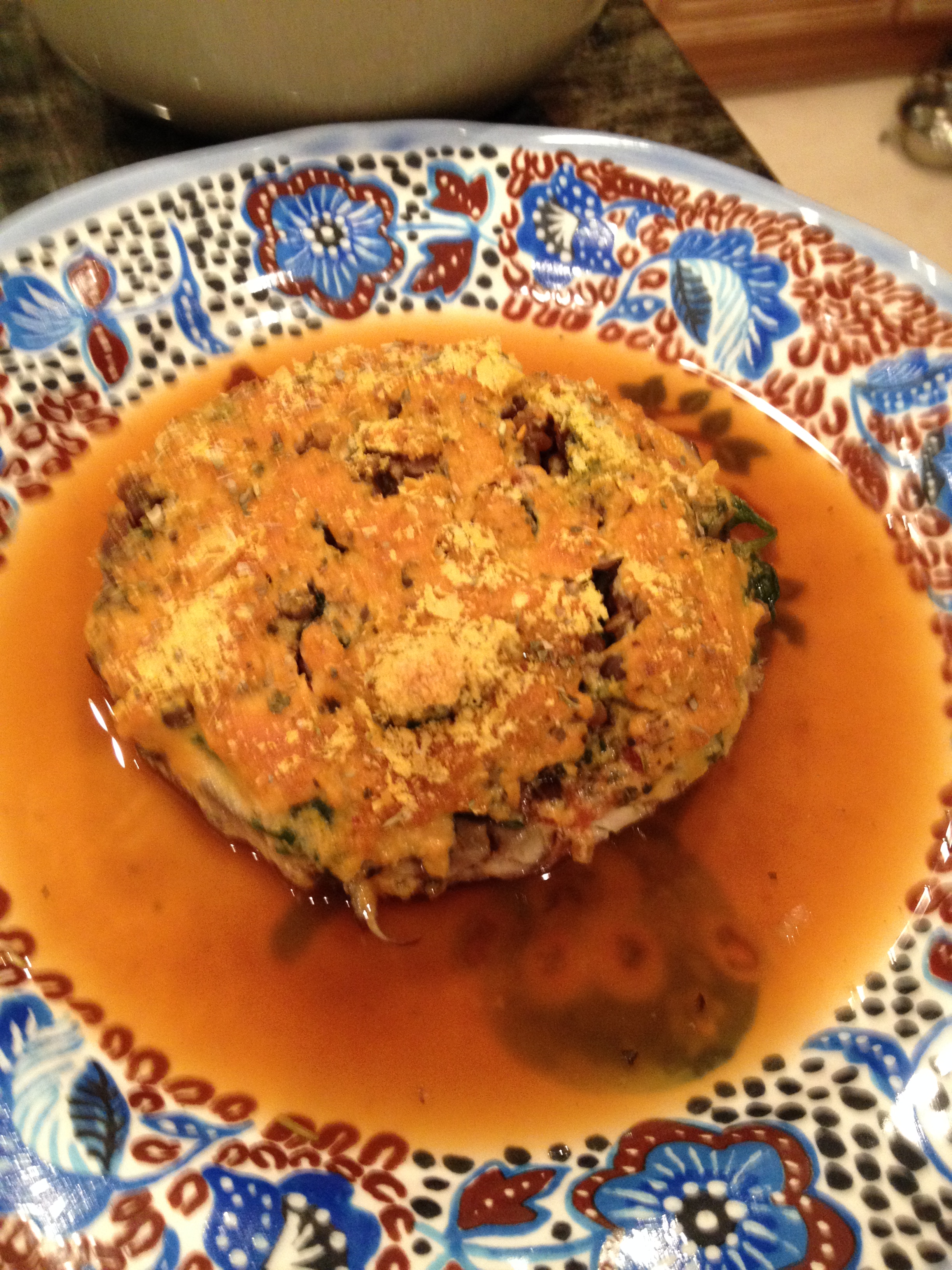 Preheat oven to 350 degrees. Follow package directions to make lentils. In a small pot, heat up pizza sauce and simmer the greens and the oregano in the sauce until soft. Then add the cooked lentils. Meanwhile, prepare the portobello mushroom by cleaning it and scraping out the grills on the underside with a spoon. This will make space for the filling. Mix the nutritional yeast, salt and Italian seasoning together in a small bowl. Then place mushroom upside-down on a foil-lined baking sheet. Pour the sauce with the lentils and greens into the mushroom cavity. Top with the nutritional yeast mixture. Bake for 10-15 minutes depending on size of the mushroom.