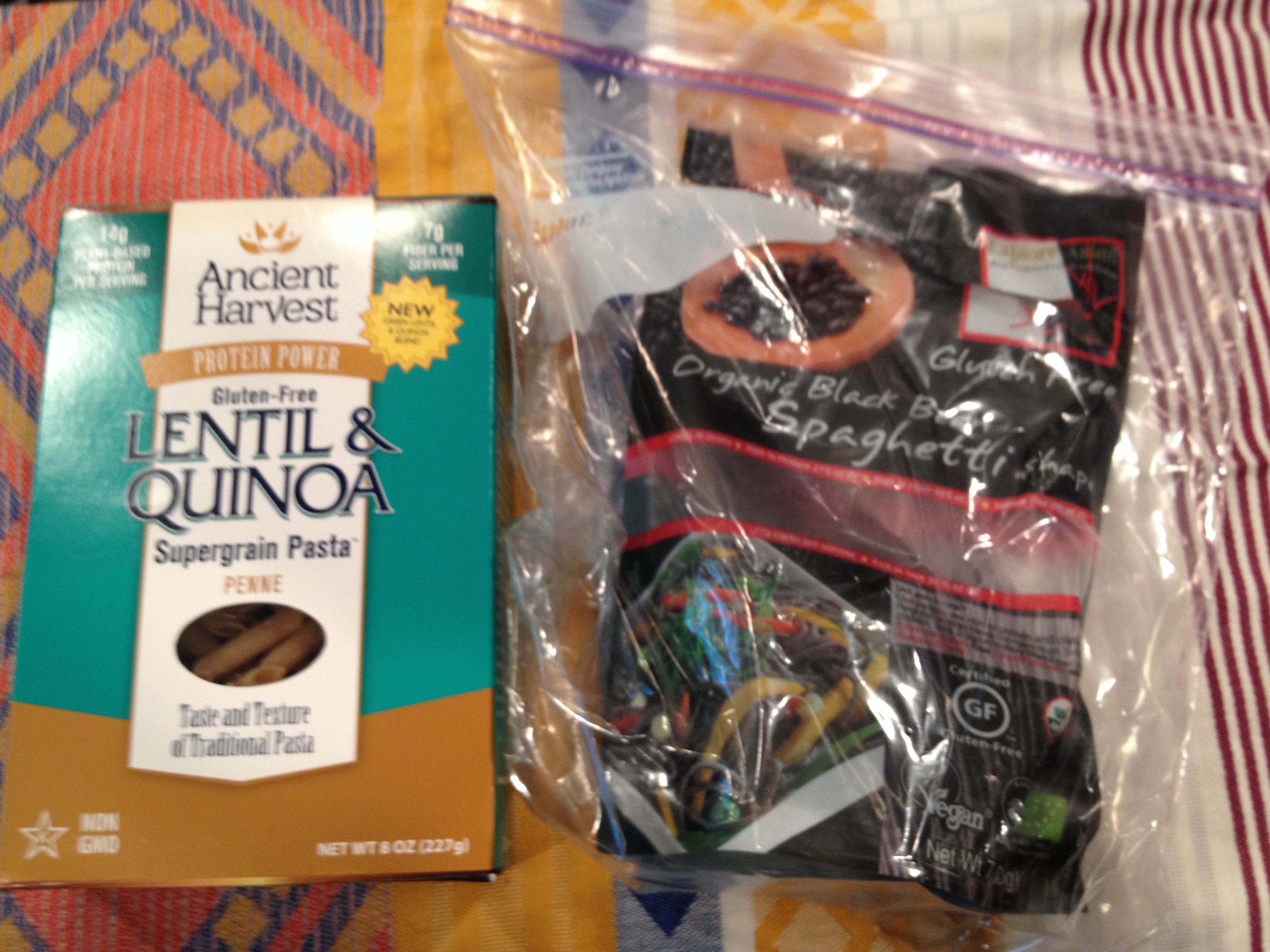 In addition, I store a few different kinds of gluten-free pasta in my kitchen cabinets. My current pantry pastas are Ancient Harvest Green Lentil and Quinoa Penne and Explore Asia Black Bean Spaghetti. Both are high in protein, and hold up better, in my opinion, to rice or corn pastas. I use the black bean spaghetti in Asian and Mexican dishes, and the lentil and quinoa penne with marinara or other Italian sauces.