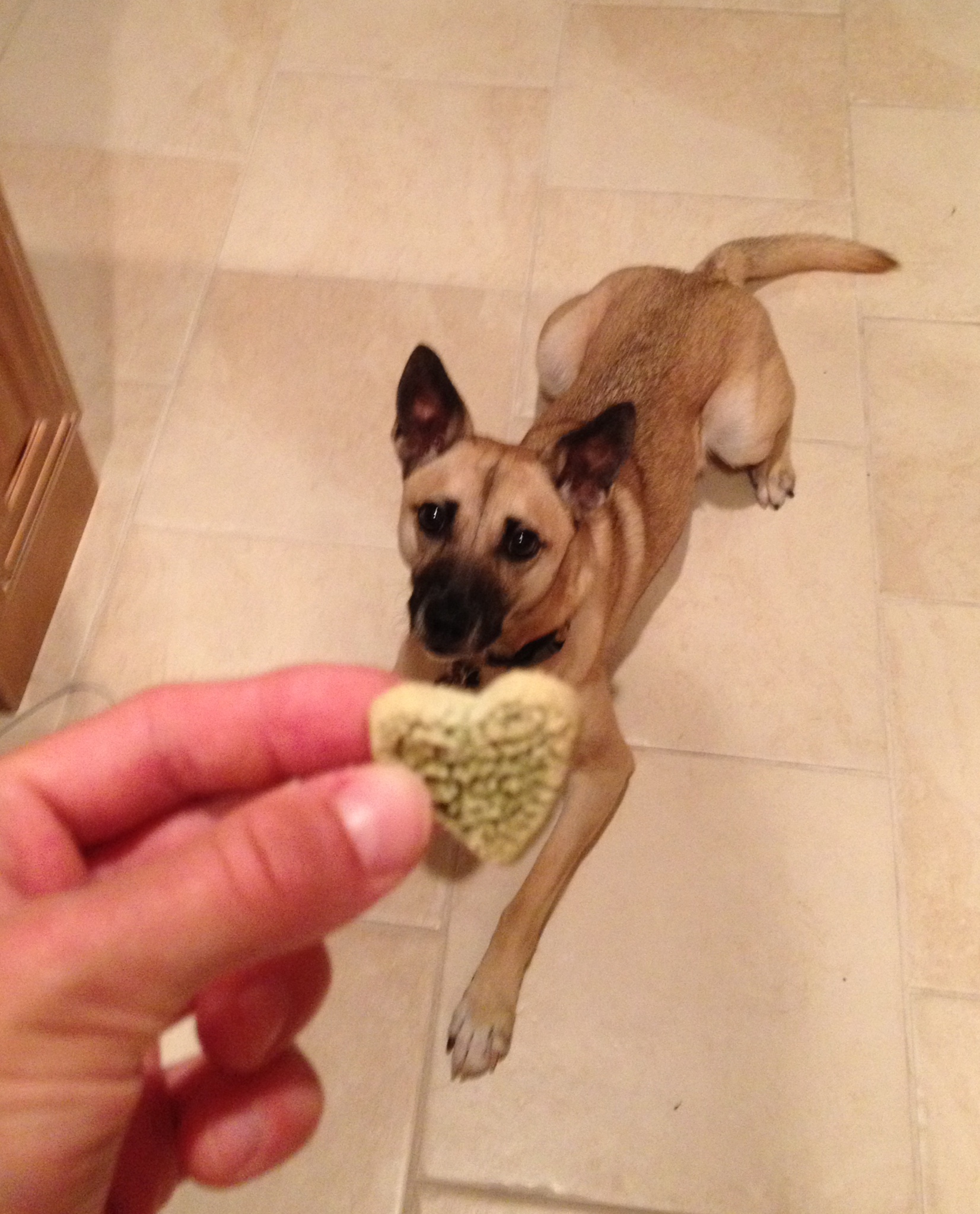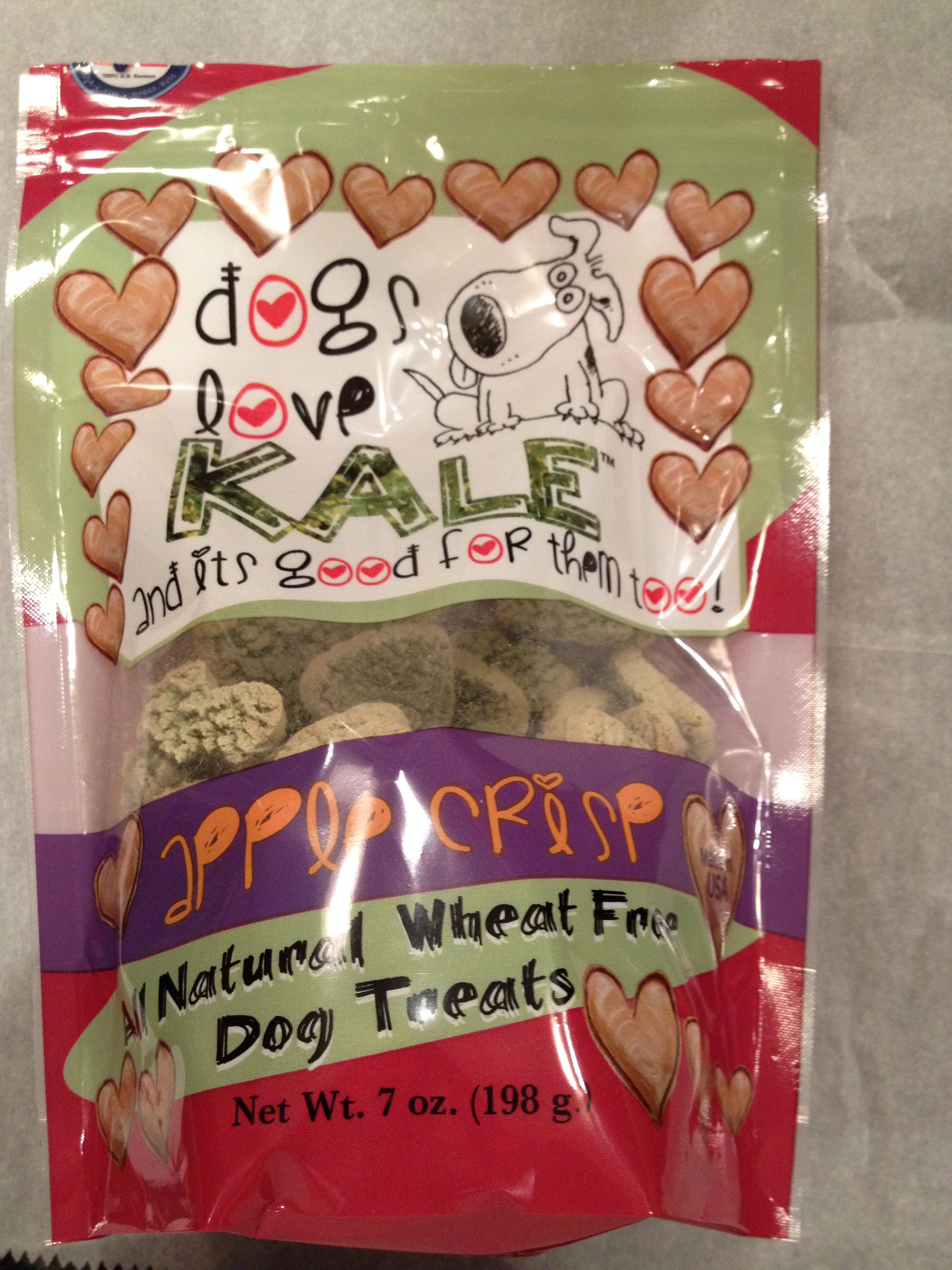 My dog loves these little heart-shaped treats. And, since they’re loaded with good ingredients, I love to give them to her. Rynoa received these awesome Dog Love Kale treats in her monthly Barkbox. I had never heard of them before, but when I read the ingredients of the apple crisp flavor, I was impressed. They only have five ingredients: rice flour, kale, whole oats, flax and apple. The other flavors (penutty, pumkin’, tropical delight and sweet tater) are also all gluten free and vegan.
