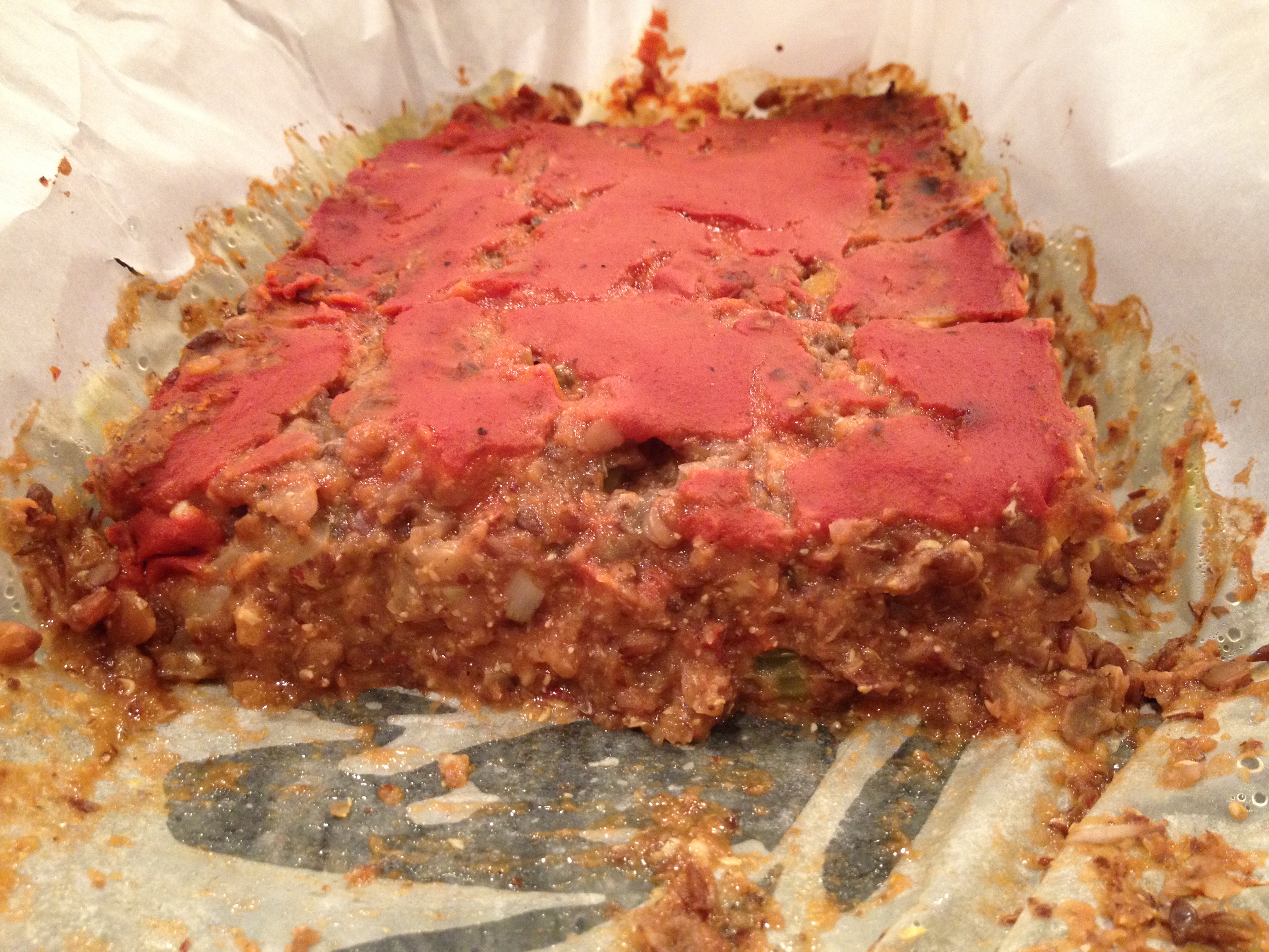 Line a bread loaf pan with parchment paper. Spoon the lentil and veggie mixture into the pan and spread until it’s evenly distributed in the pan. Then top the mixture with the remaining sauce. Bake 50 minutes. The edges of the loaf should be brown and a toothpick inserted into the loaf should come out clean. Bake it longer if necessary.