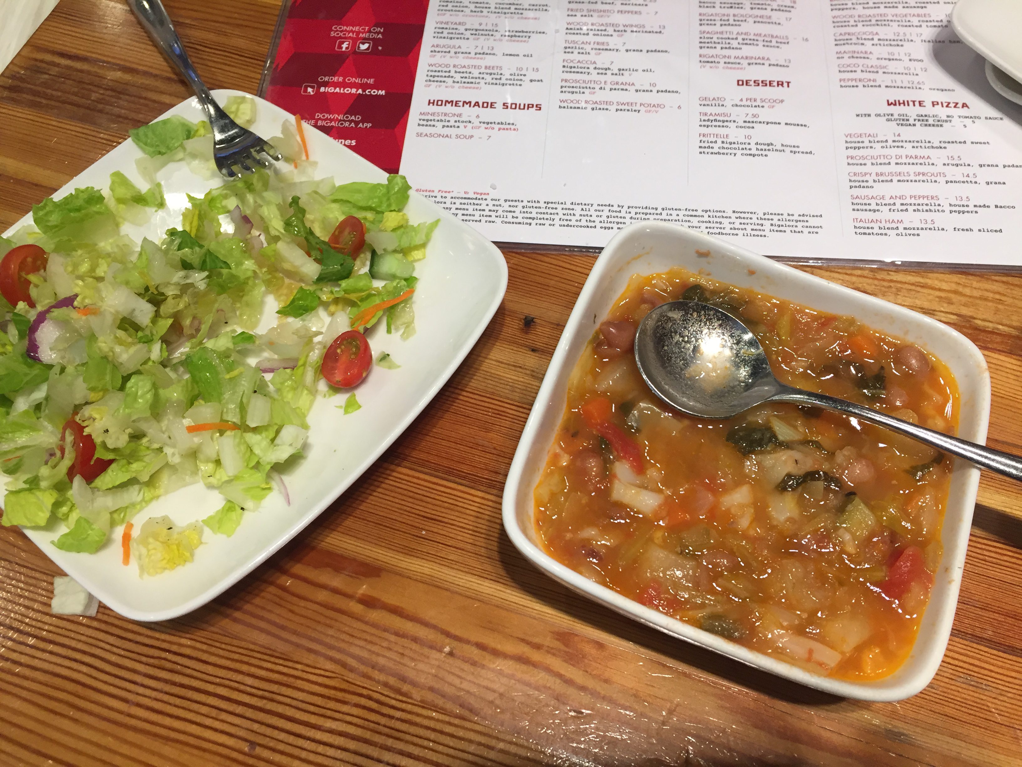 The good news is there’s many other gluten-free and vegan choices besides pizza on Bigalora’s menu. As a bonus, they clearly mark everything that is or how it can be made that way. They have gluten-free pasta and many other veggie appetizers that can be made gluten-free. My go-to is the minestrone soup, which is safe without the pasta and cheese, house salad minus the cheese and croutons, and Crispy Brussels Sprouts without the grana padano. I ask them to cook the brussels in a pan instead of frying them since it’s not a dedicated gluten-free fryer. The minestrone soup is a really nice treat, as gluten-free minestrone is a rare find.