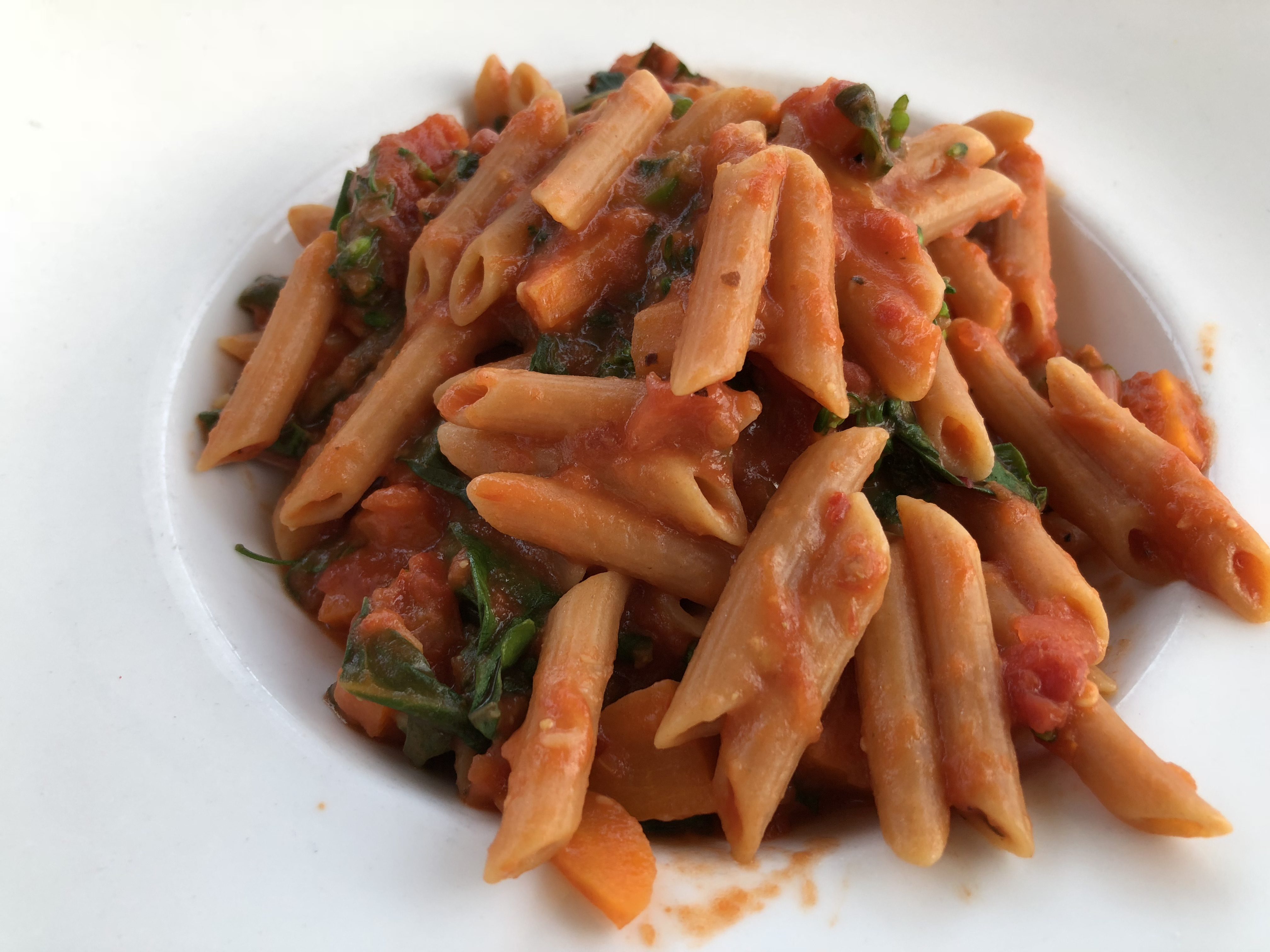A few minutes later, he return with a giant bag of penne. It was from a large legume and potato products food service retailer, who supplies to well-known brands. The specific pasta is made of lentil, white rice, and pea protein. If it sounds familiar, it’s because it’s the pasta supplied to Modern Table for their “Complete Protein” pasta. Since the retailer only makes legume and potato products, I assumed that it would be safe from cross-contamination.