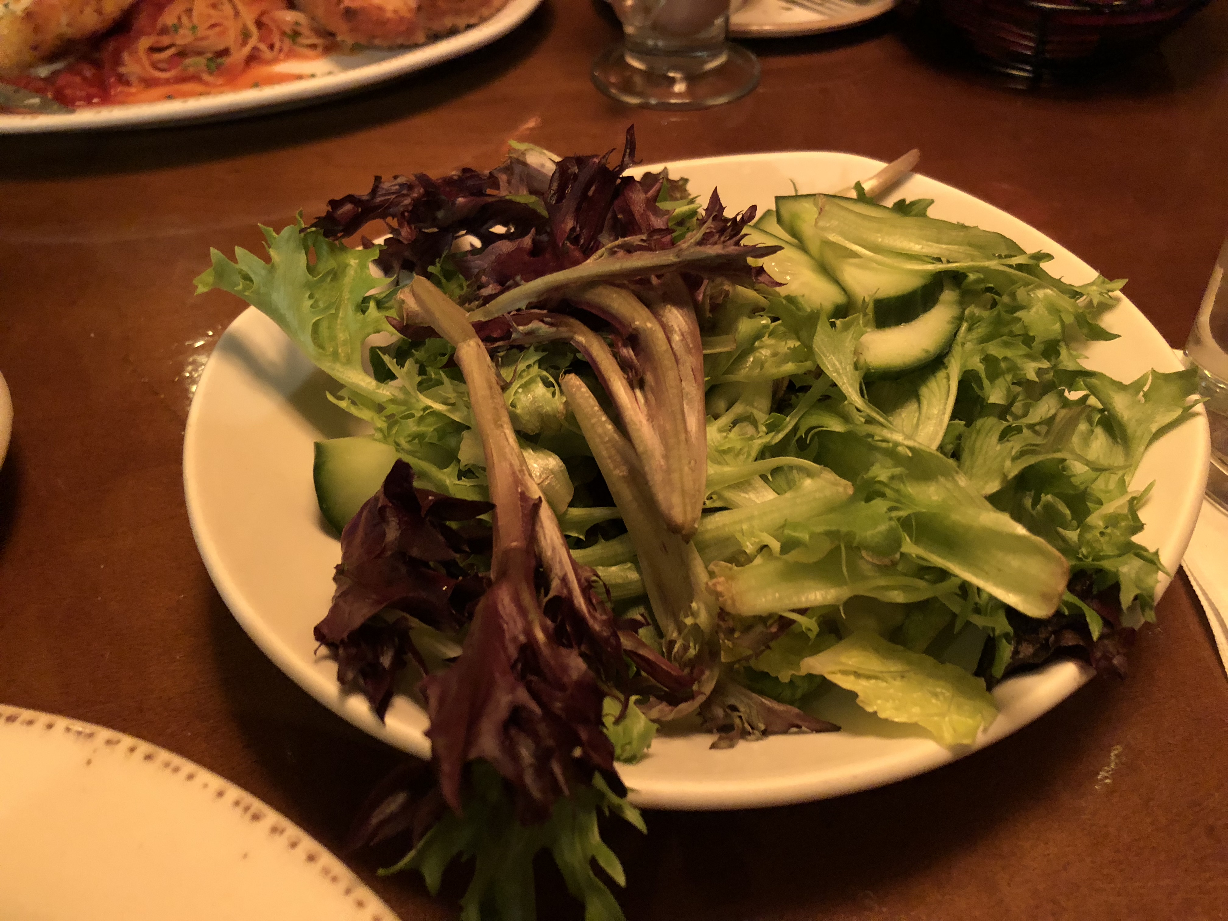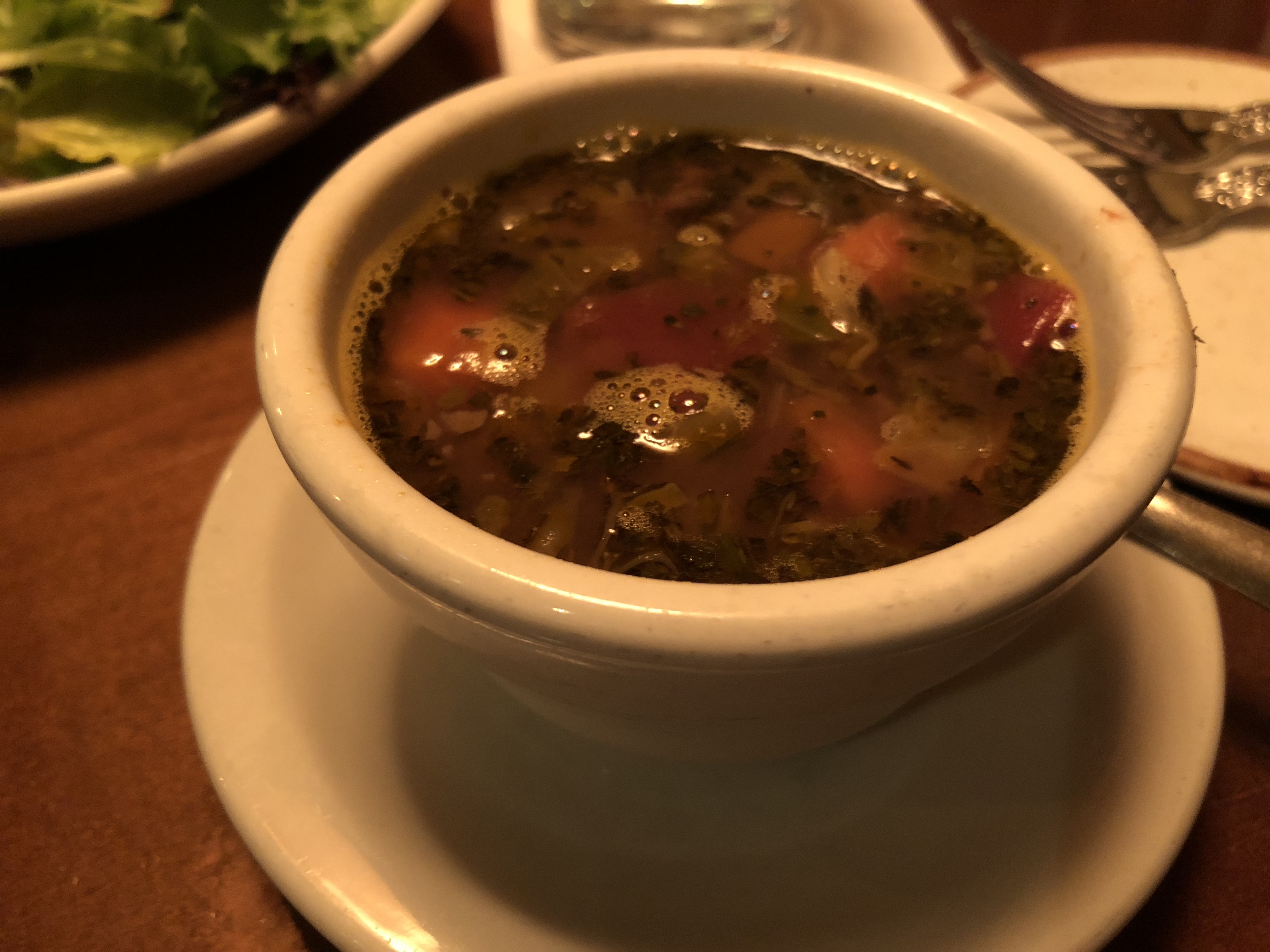 Nevertheless, I was BLOWN AWAY this evening when the manager, Ryan, recognized me and remembered my special order. While our waitress was getting our drinks, Ryan came over to the table and exclaimed, “Welcome Back!” We exchanged pleasantries and then he proceeded to tell me my usual order. He ran down the items as well as the preparation process: minestrone soup, no pasta or cheese; side salad with just lettuce and cucumber; and an array of vegetables sauteed in olive oil and tossed in tomato sauce with an extra side of tomato sauce.