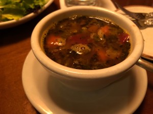Of late, my go-to has been a cup or two of the minestrone soup, side salad and a combination of their seasonal vegetables with their fantastic tomato sauce. This is a custom entree that has never appeared on the menu and yet I’ve never had any trouble ordering it.