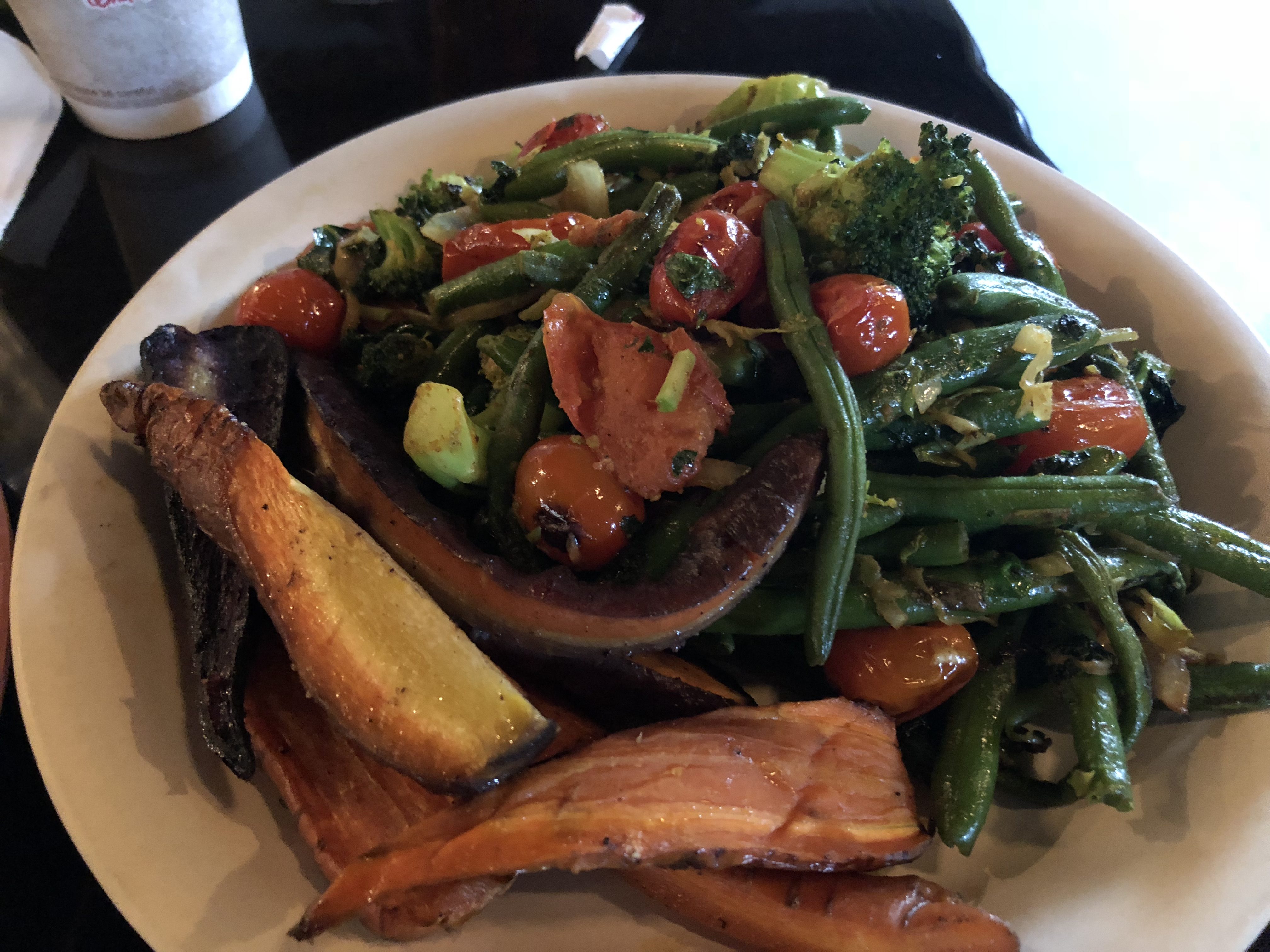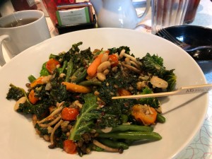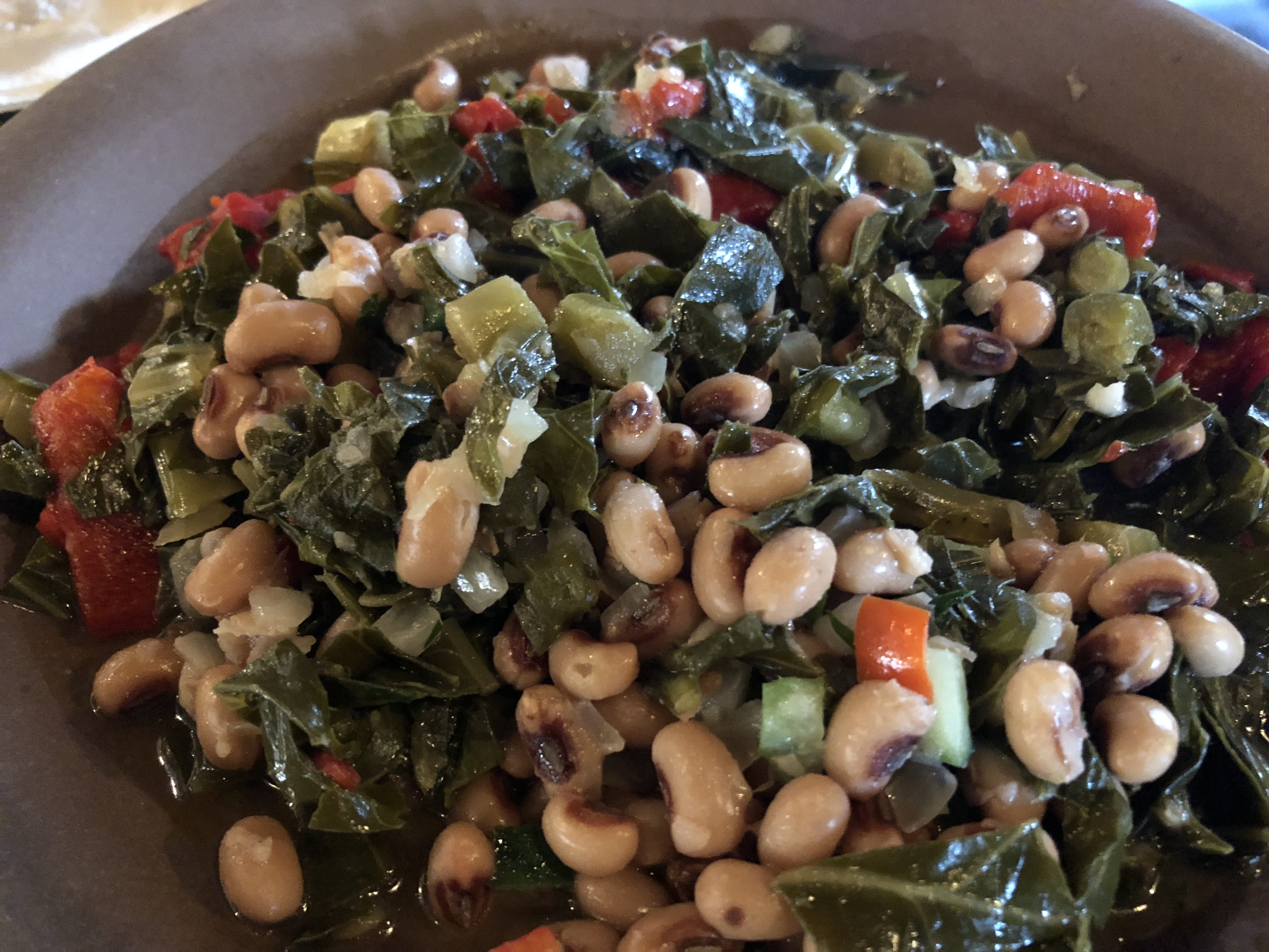 On this visit, the chef made me a giant plate of tandoori-spiced vegetables and roasted root vegetables; another plate of collard greens and roasted red peppers, a third plate of black eyed pea salad, and a final salad plate. It’s hard to say what was my favorite. I ended up mixing the black eyed pea salad with the collards and it was a great combination, but the tandoori vegetables also were on point.