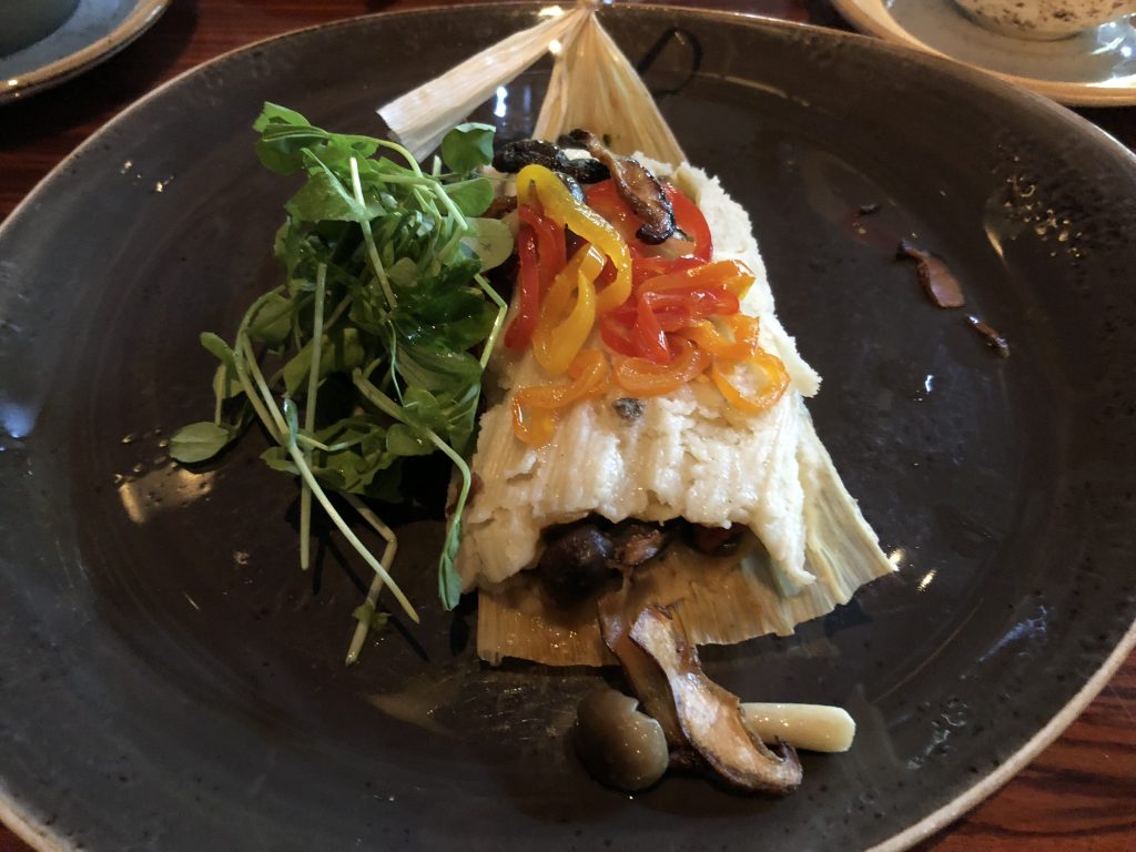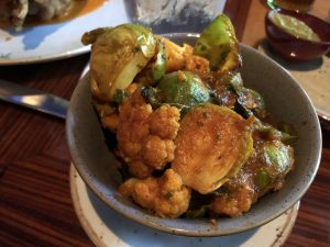 That dish is the West African Koki Corn (a vegetable tamale), which comes with mushrooms, avocado, poblano-tomatillo purée, and roasted red pepper sauce. It’s fantastic. But Jiko food is too good to only order one thing. So this time, I asked for curried roasted cauliflower and brussel sprouts and chakalaka with chickpeas.